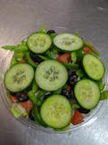 Fresh mixed lettuce, red onions, green peppers, black olives, ripe tomatoes, cucumbers and mozzarella cheese.